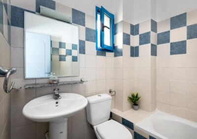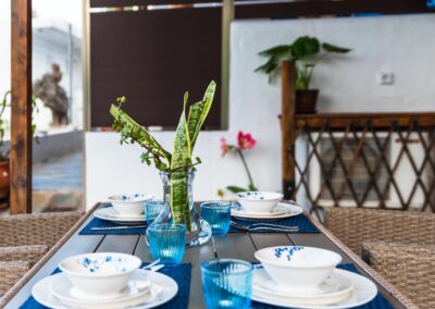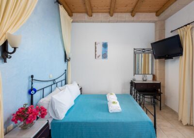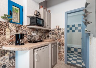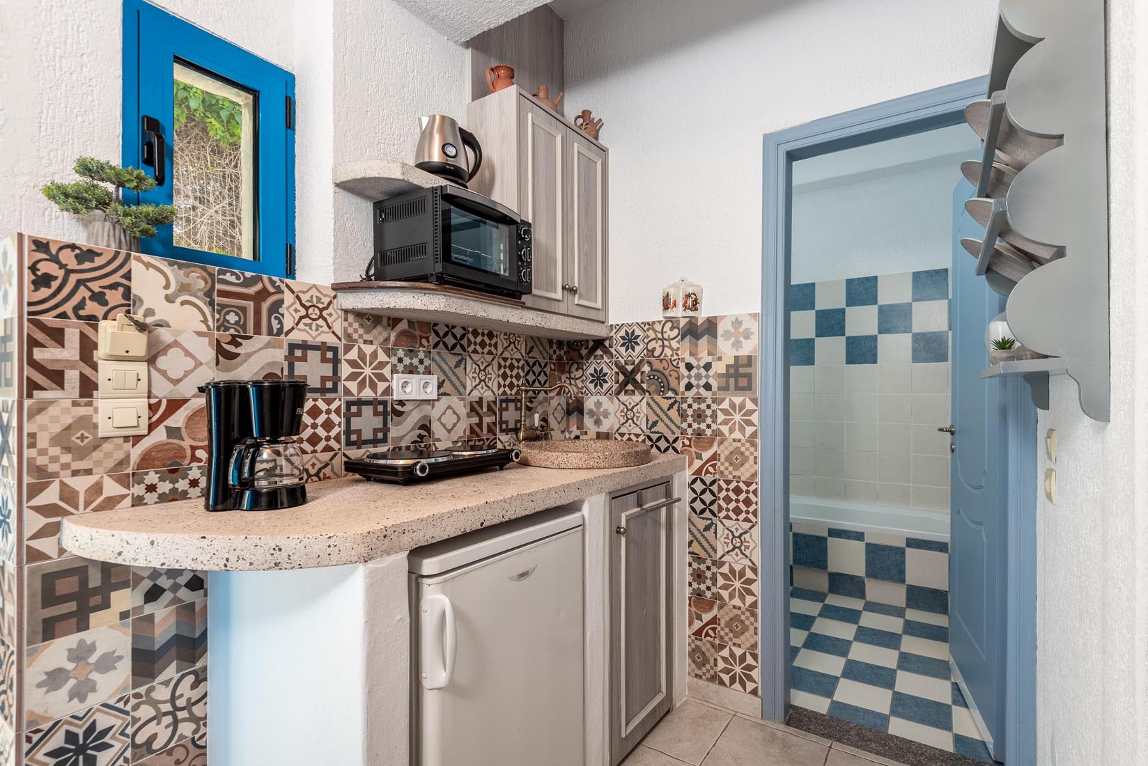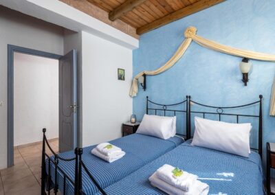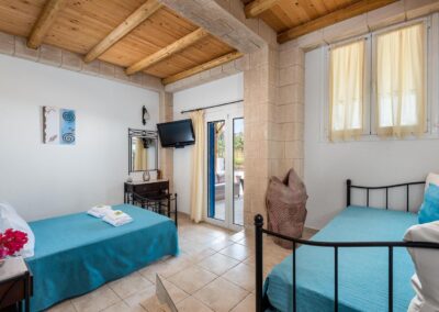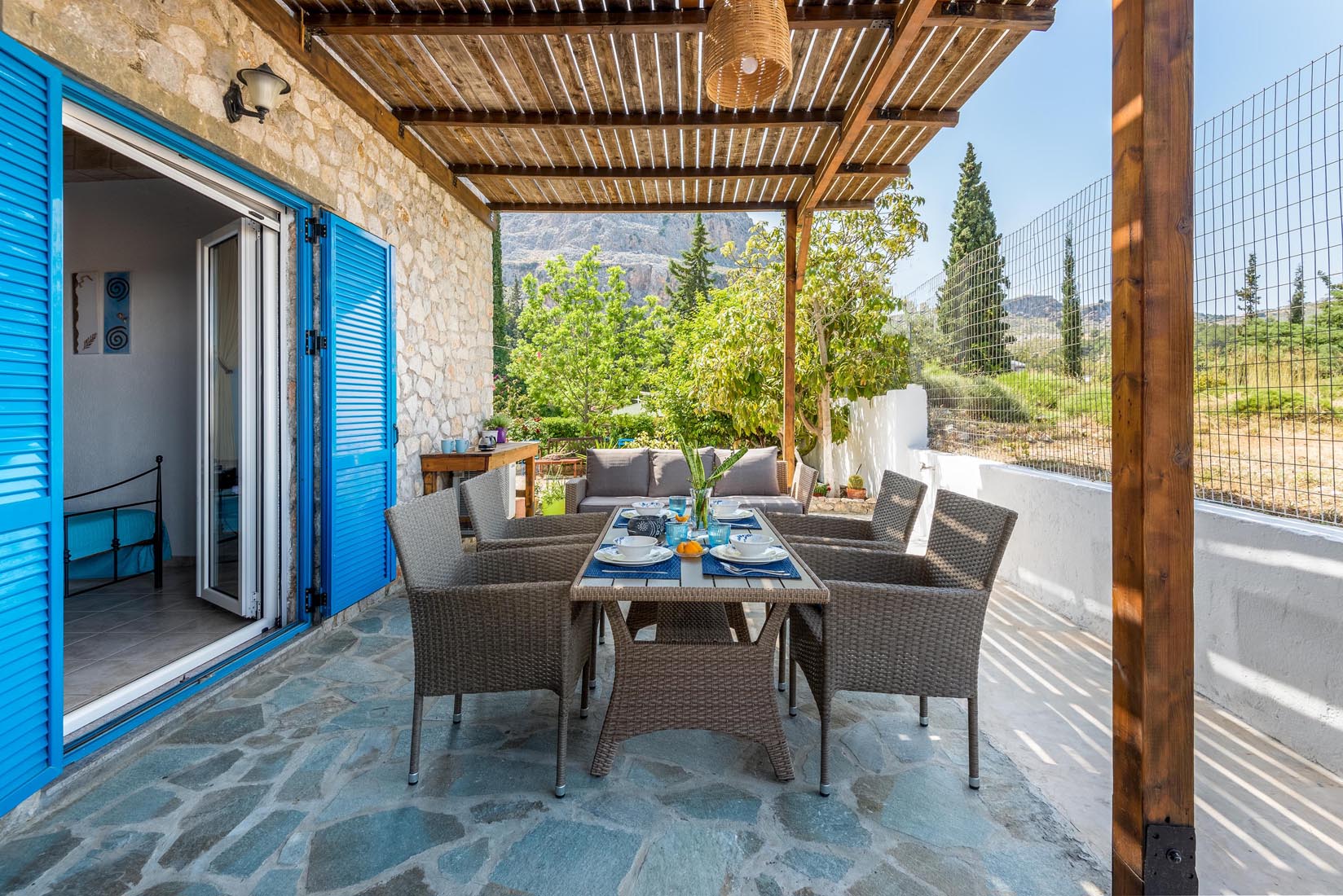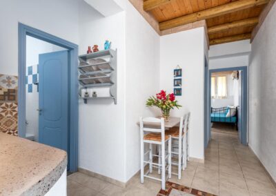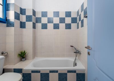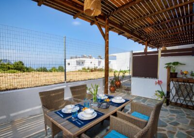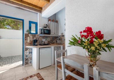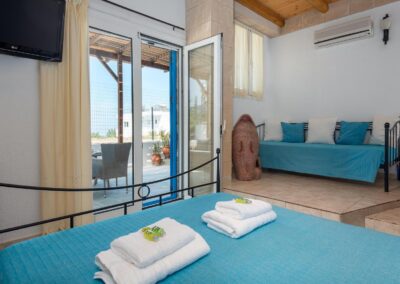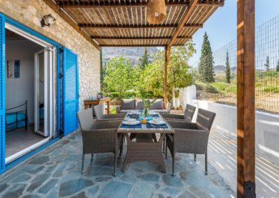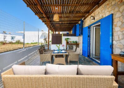 This apartment accommodates up to 5 guests and has 2 air-conditioned bedrooms, one with a double bed and one with twin beds. Also, there is a sofa bed. The blue shade decoration blends in with Stegna beach view. You’ll feel peace as long as you enter the door. There a bathroom with a bathtub. Also, there is a kitchenette suitable for the preparation of a meal and a seating area. Outdoors, there’s an incredible seating area and BBQ facilities where you can relax and enjoy a delicious meal surrounded by the picturesque view of stegna.